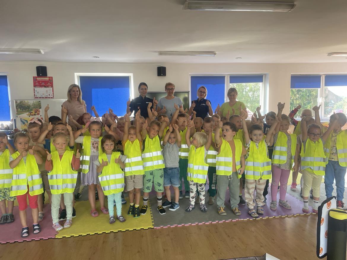 18 września 2024 roku w naszym przedszkolu odbyło się spotkanie z policjantkami z Komendy Powiatowej Policji w Gołdapi. Tematem spotkania było utrwalenie z dziećmi podstawowych zasad bezpieczeństwa na drodze. Panie policjantki przypomniały dzieciom jak prawidłowo przechodzić przez jezdnię oraz jak bezpiecznie poruszać się rowerem i hulajnogą. Na zakończenie dzieci otrzymały w prezencie kamizelki odblaskowe, aby być bezpiecznym, bardziej widocznym podczas przedszkolnych spacerów. Przedszkolaki wręczyły podziękowanie za ciekawe spotkanie i usystematyzowanie wiedzy na temat zasad bezpieczeństwa w ruchu drogowym.