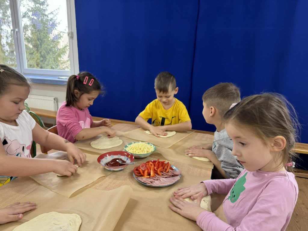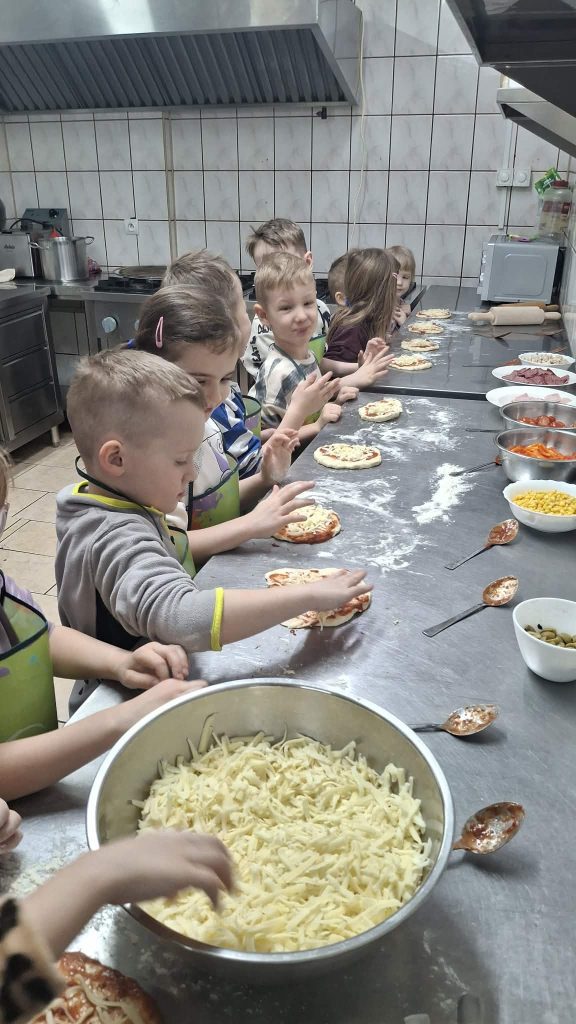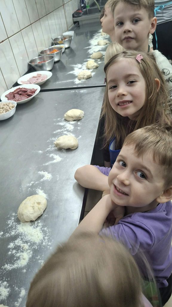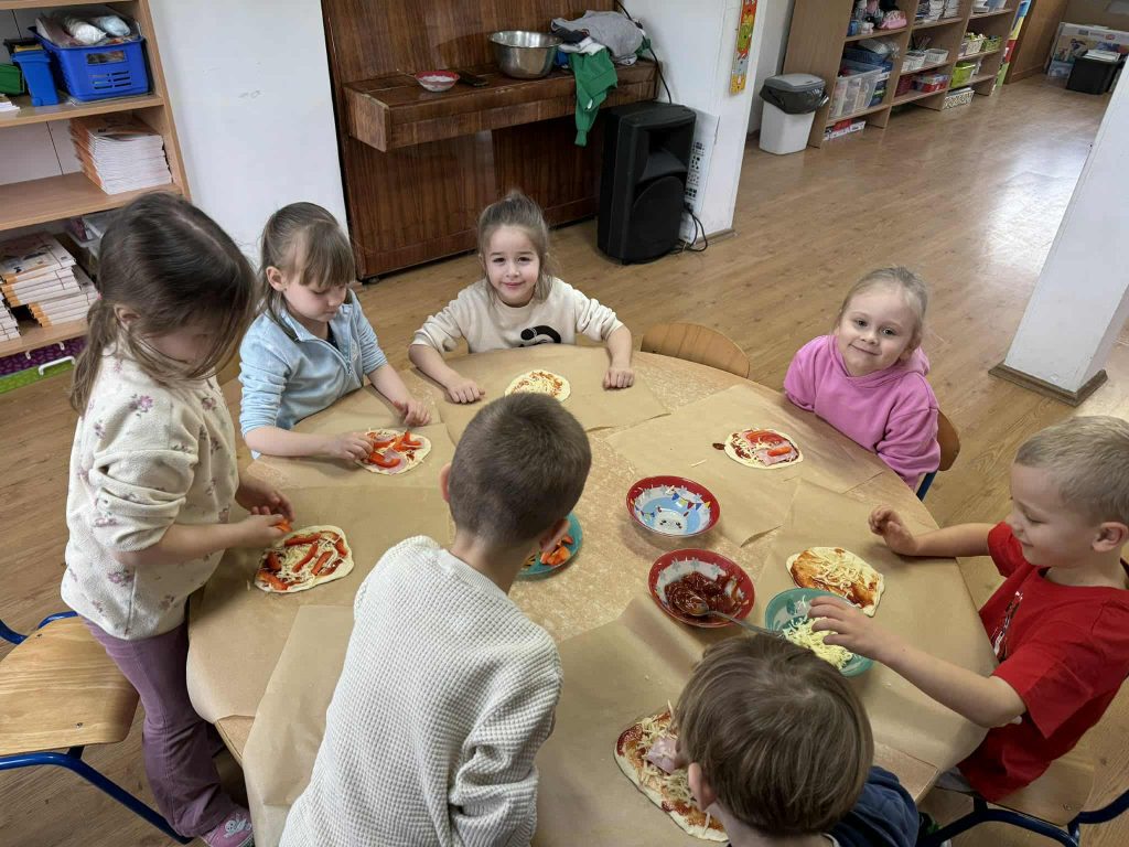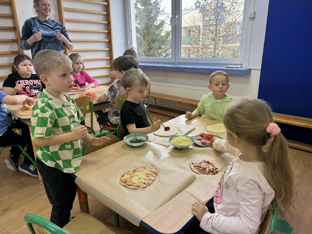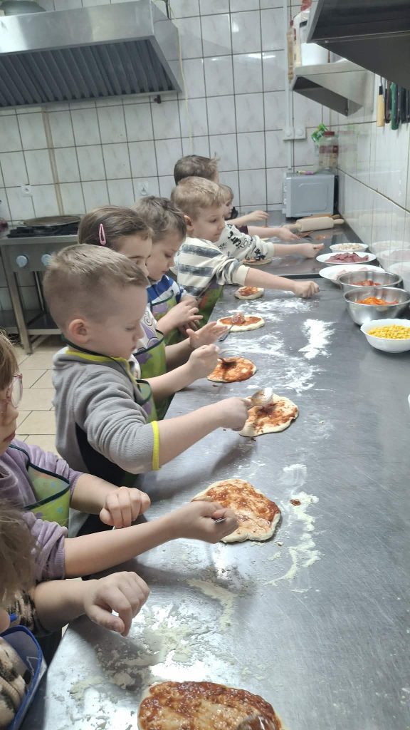 Dzieci poznały krótką historię pizzy, a następnie przystąpiły do działania. Przedszkolaki samodzielnie przygotowały swoje wypieki . Od smarowania ciasta sosem pomidorowym, po układanie ulubionych dodatków. Na stołach pojawiły się różnorodne składniki: ser, szynka, papryka oraz pomidory. Dzięki temu ćwiczyły samodzielność, współpracę oraz doskonaliły sprawność manualną podczas komponowania swoich kulinarnych dzieł.