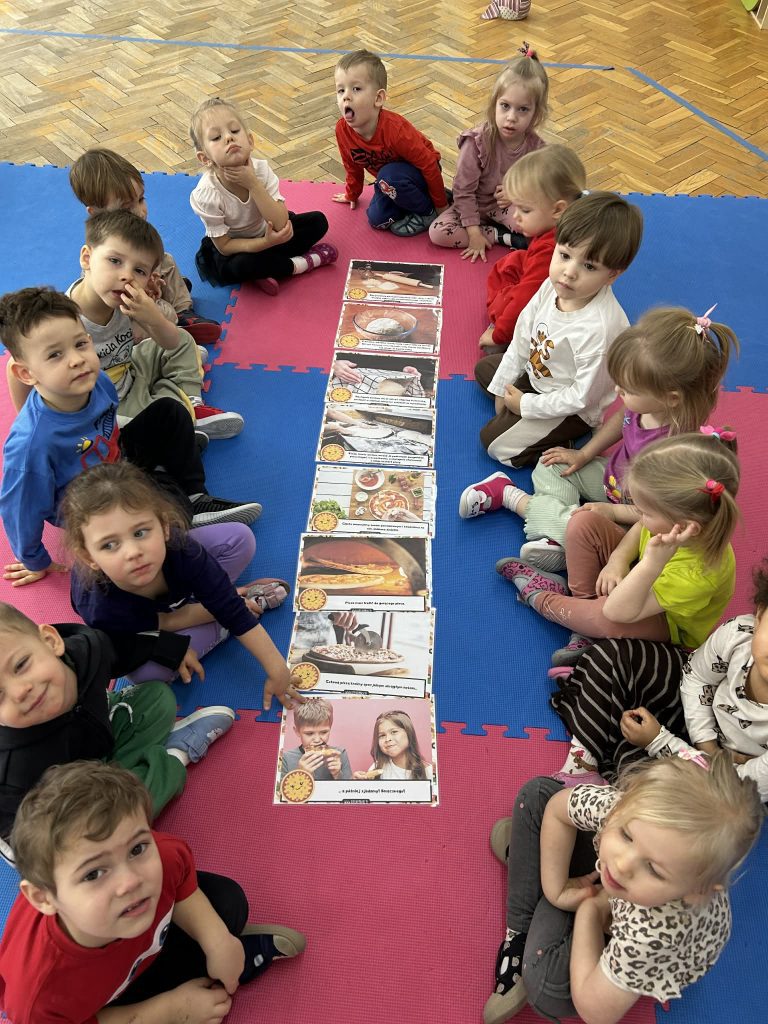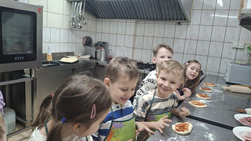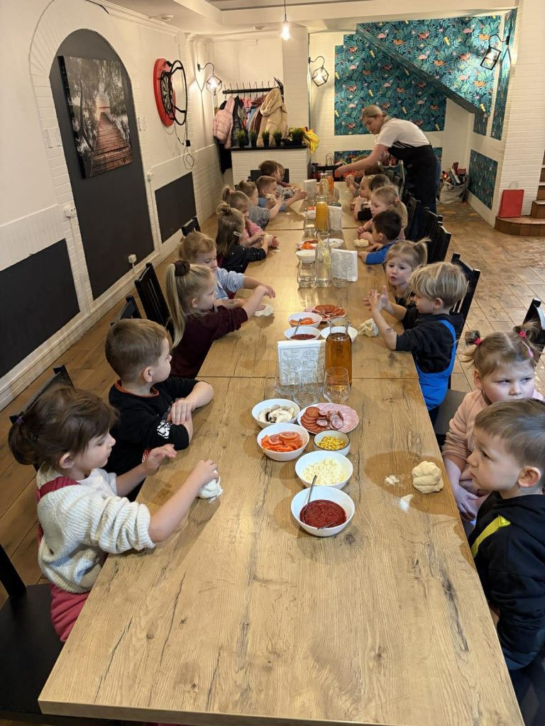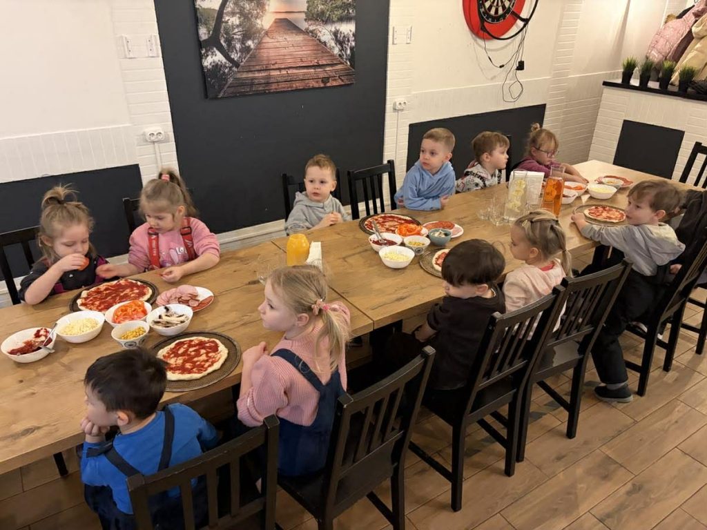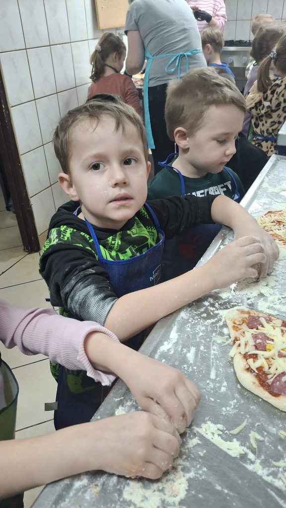 Dzieci poznały krótką historię pizzy, a następnie przystąpiły do działania. Przedszkolaki samodzielnie przygotowały swoje wypieki . Od smarowania ciasta sosem pomidorowym, po układanie ulubionych dodatków. Na stołach pojawiły się różnorodne składniki: ser, szynka, papryka oraz pomidory. Dzięki temu ćwiczyły samodzielność, współpracę oraz doskonaliły sprawność manualną podczas komponowania swoich kulinarnych dzieł.