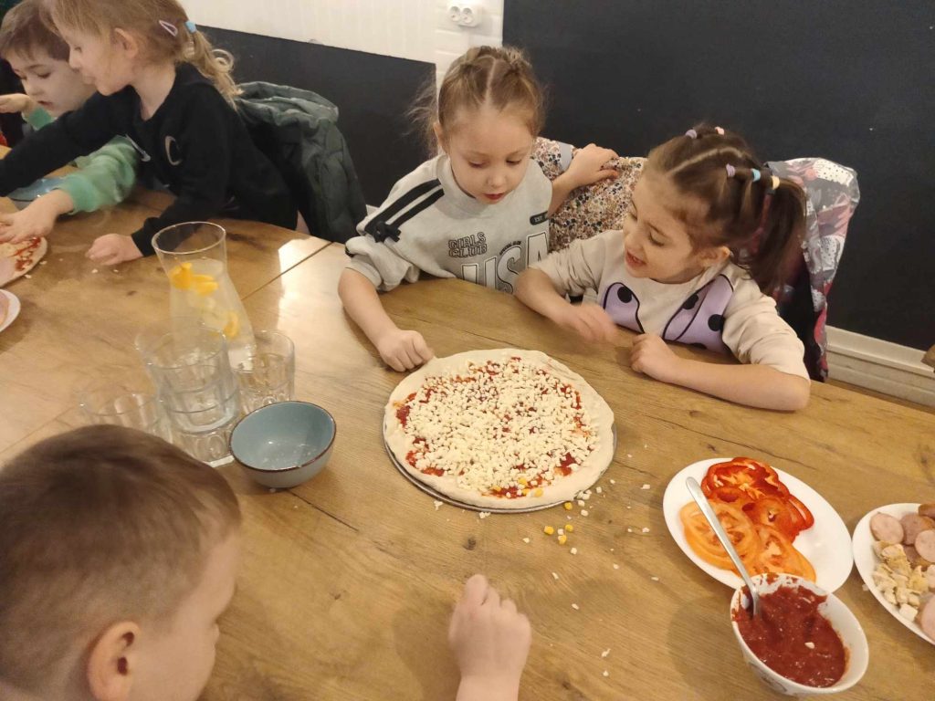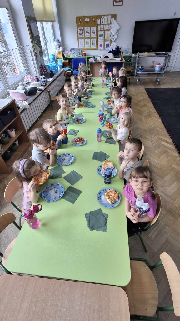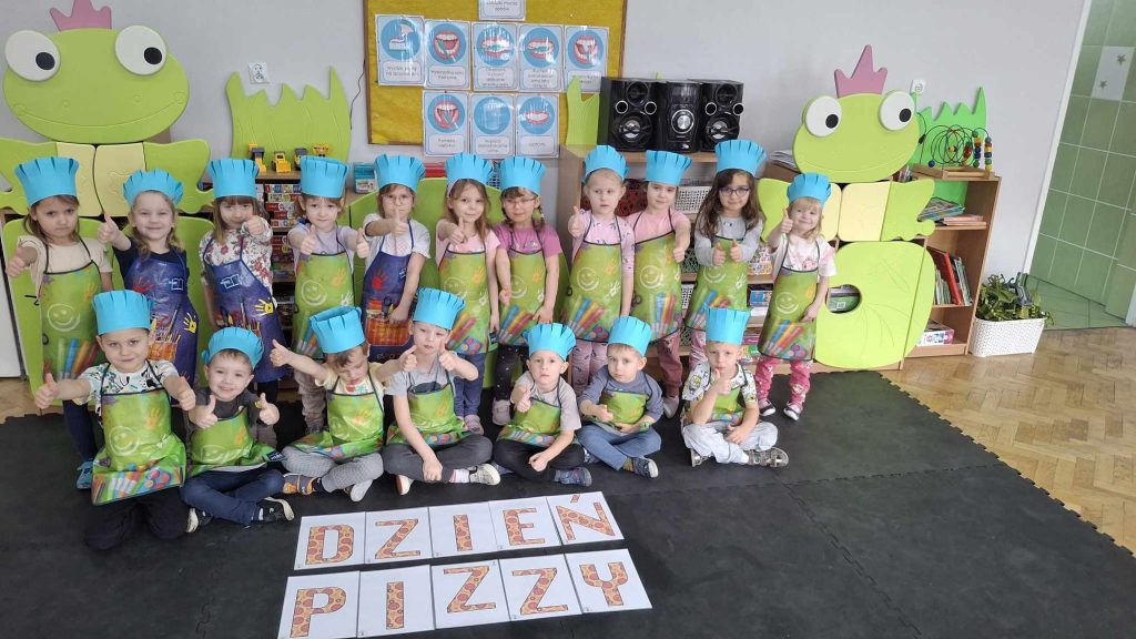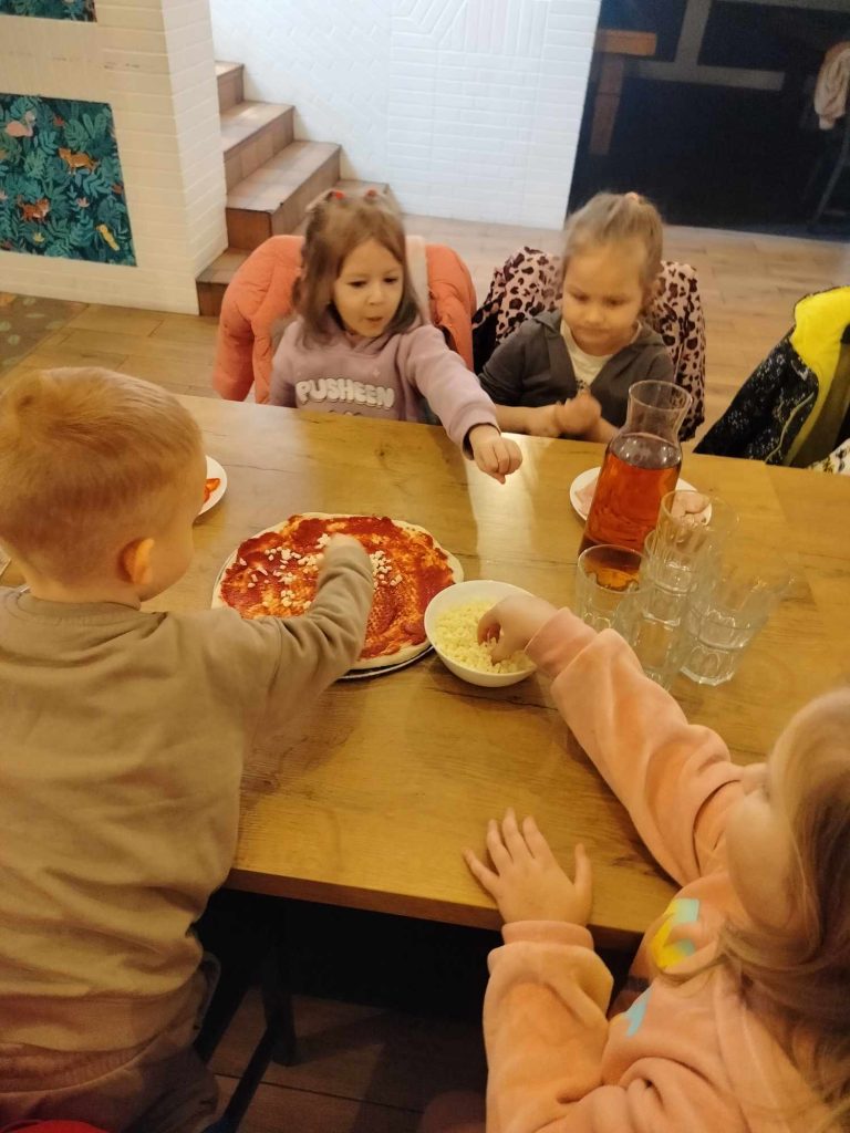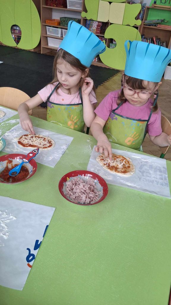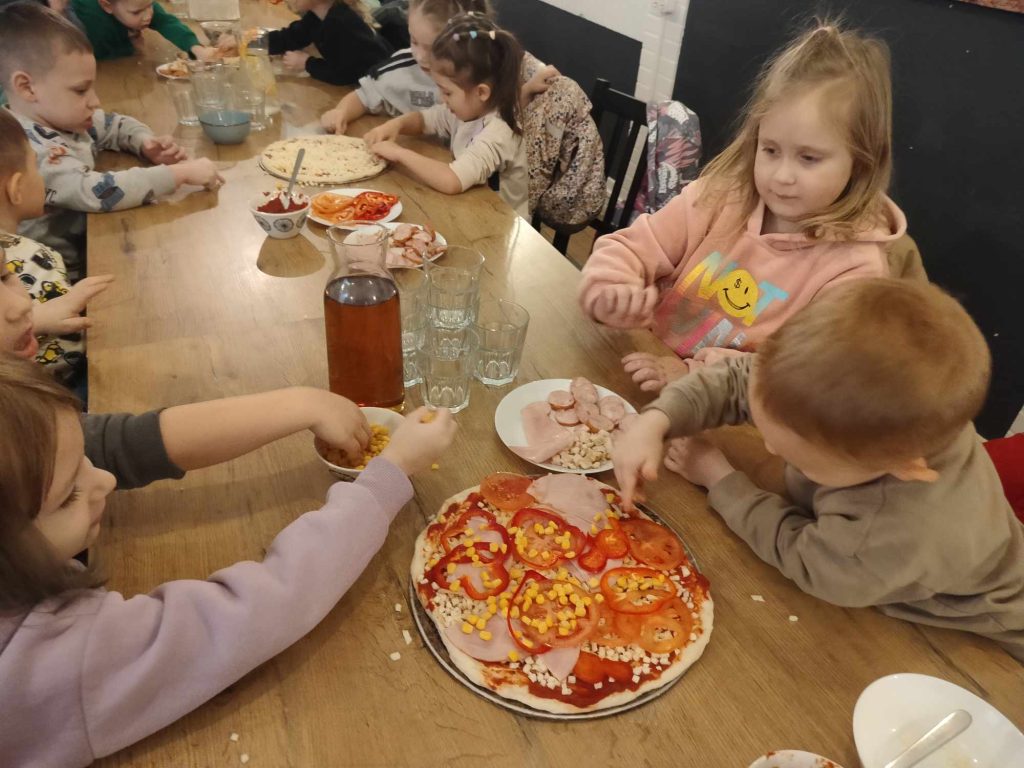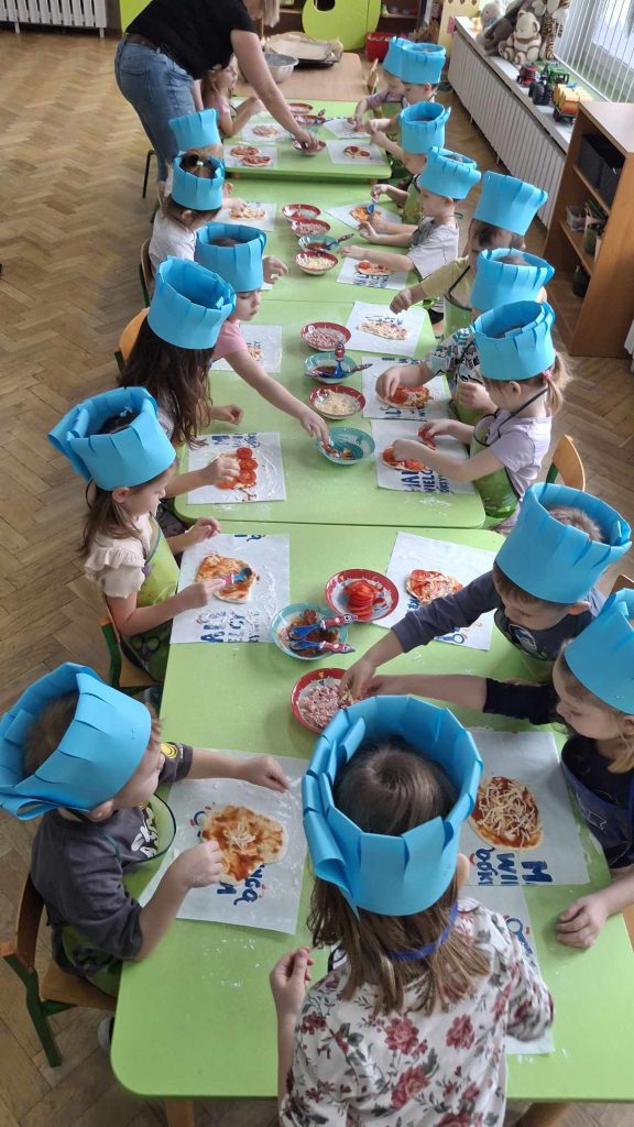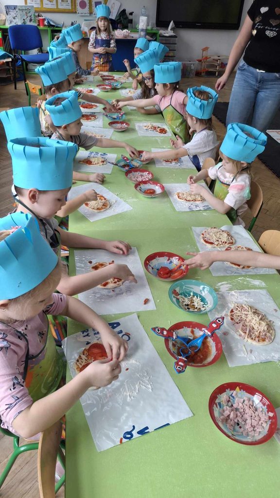 9 lutego w naszym przedszkolu obchodziliśmy Dzień Pizzy. Z tej okazji dzieci grupy 4-latków ,,A” , 3-latków ,,A” oraz 5-latków ,,C” wybrały się z wizytą do pizzerii, a pozostałe przedszkolaki wcieliły się w rolę kucharzy w przedszkolu. Dzieci poznały historię pochodzenia pizzy, sposób jej przygotowania oraz potrzebne składniki. Po części teoretycznej mogły przystąpić do działania. Z wielkim zaangażowaniem zabrały się do pracy. Ugniatały ciasto, formowały placki, smarowały sosem, układały ulubione składniki: wędlinę, paprykę, kukurydze i posypywały wszystko serem. Przygotowane pizze trafiły do pieca. Piękne zapachy rozchodziły się po całym przedszkolu. Dzieci z niecierpliwością czekały na degustację swojej pizzy, które w mgnieniu oka zniknęły z talerzy.