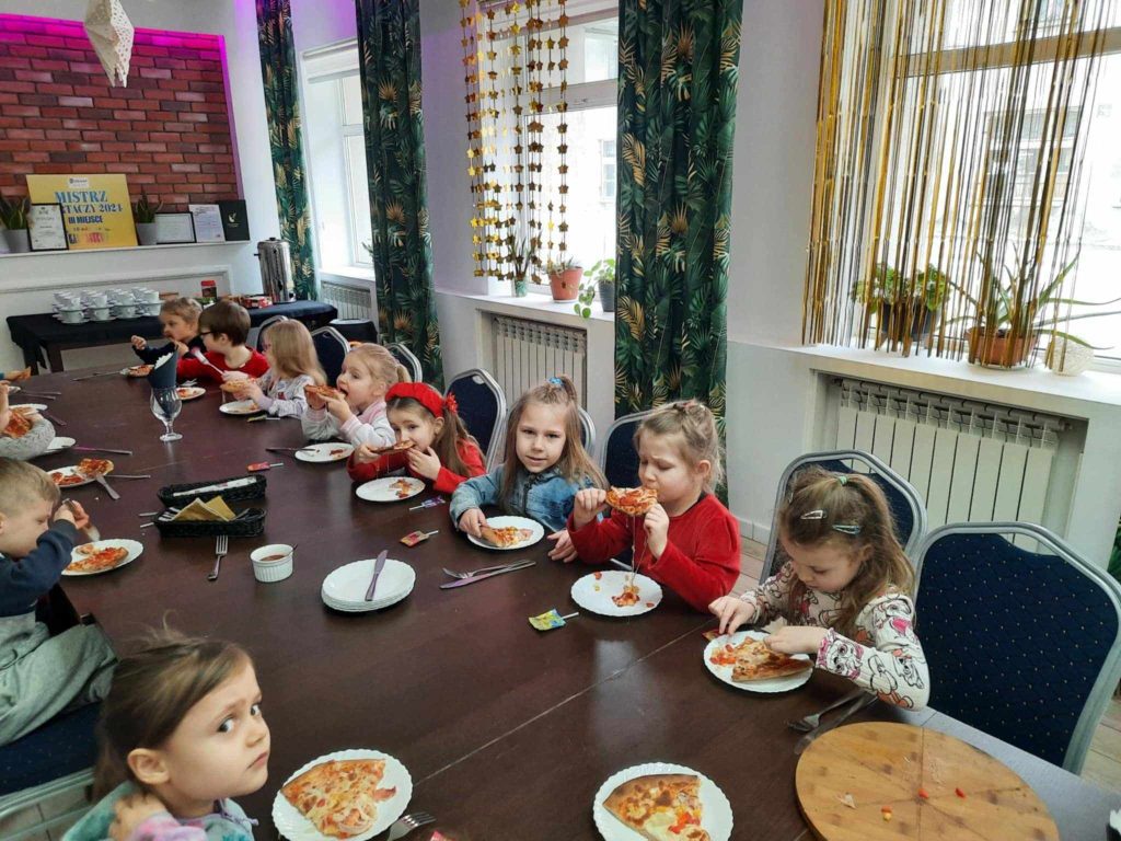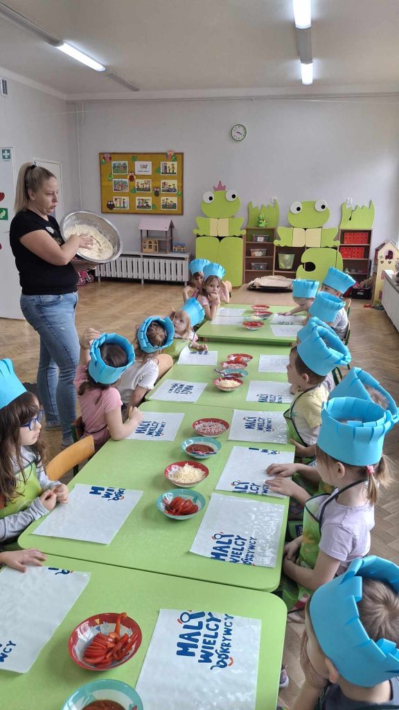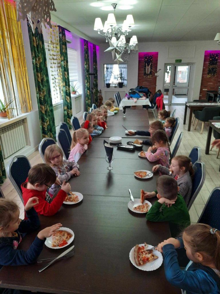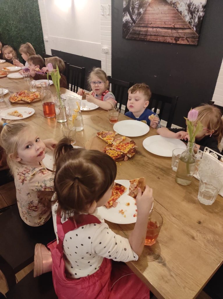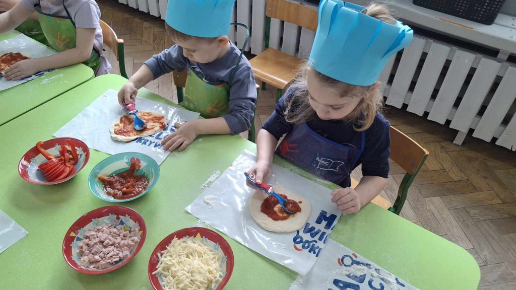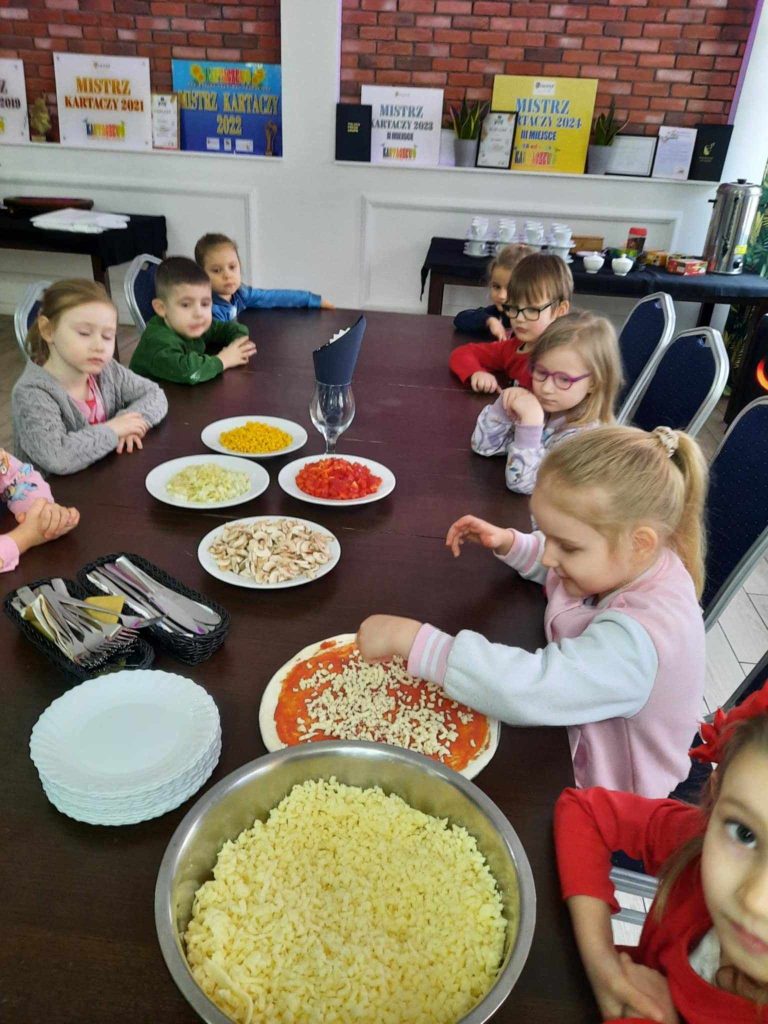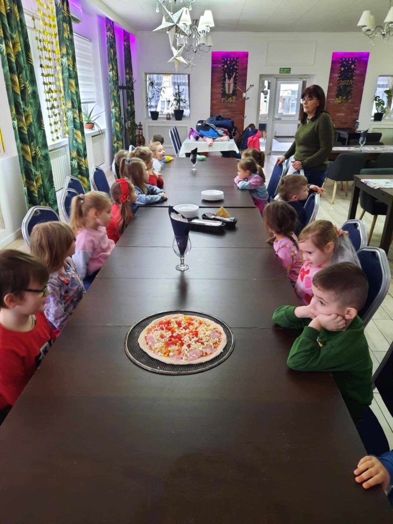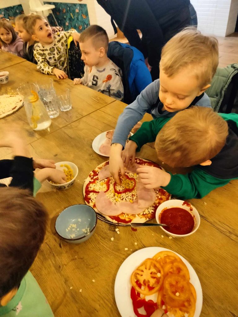 9 lutego w naszym przedszkolu obchodziliśmy Dzień Pizzy. Z tej okazji dzieci grupy 4-latków ,,A” , 3-latków ,,A” oraz 5-latków ,,C” wybrały się z wizytą do pizzerii, a pozostałe przedszkolaki wcieliły się w rolę kucharzy w przedszkolu. Dzieci poznały historię pochodzenia pizzy, sposób jej przygotowania oraz potrzebne składniki. Po części teoretycznej mogły przystąpić do działania. Z wielkim zaangażowaniem zabrały się do pracy. Ugniatały ciasto, formowały placki, smarowały sosem, układały ulubione składniki: wędlinę, paprykę, kukurydze i posypywały wszystko serem. Przygotowane pizze trafiły do pieca. Piękne zapachy rozchodziły się po całym przedszkolu. Dzieci z niecierpliwością czekały na degustację swojej pizzy, które w mgnieniu oka zniknęły z talerzy.