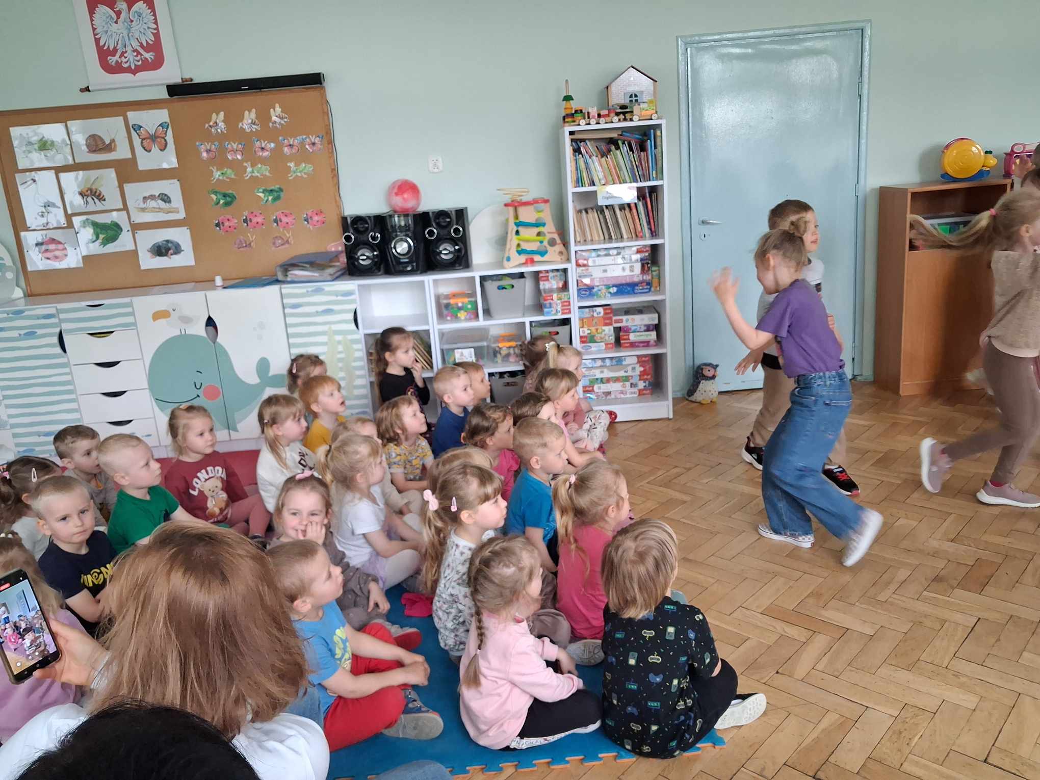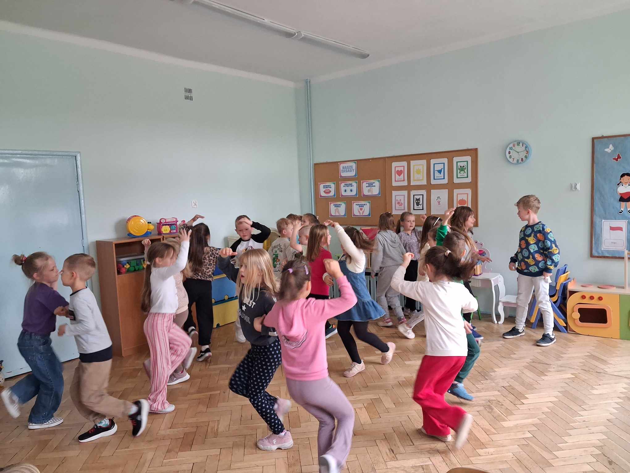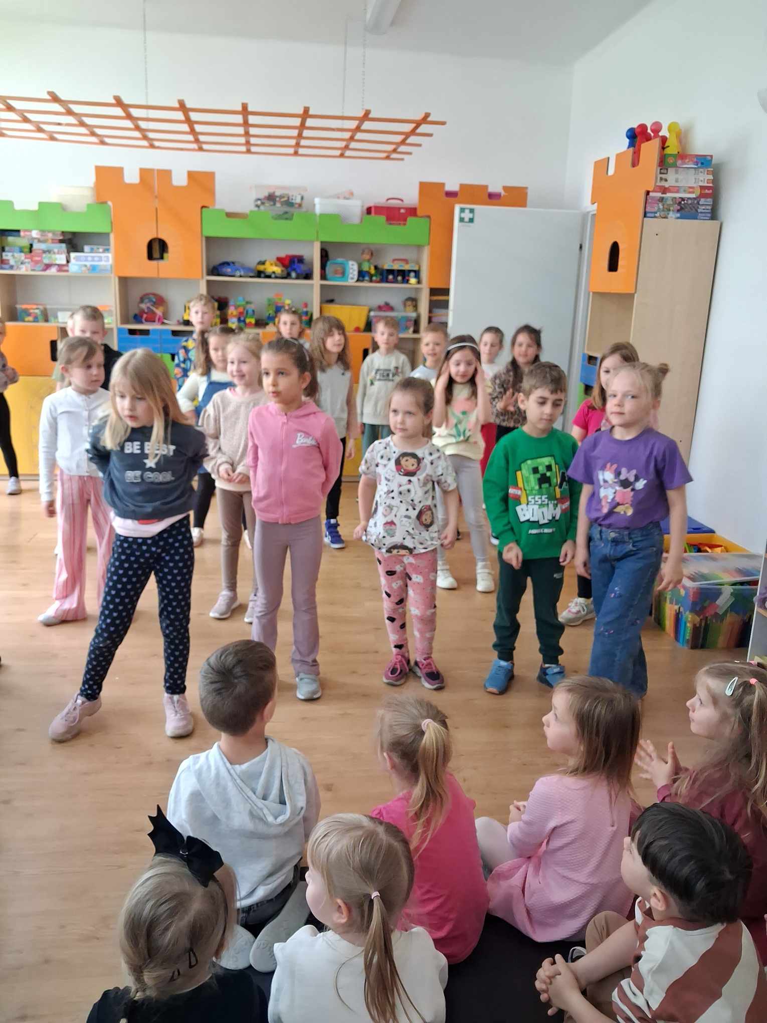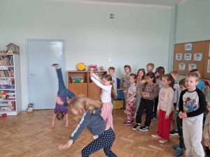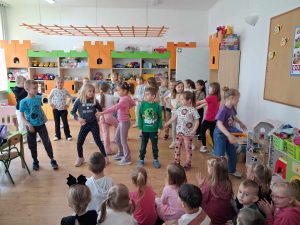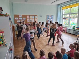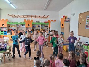 W ramach współpracy Przedszkola Samorządowego nr 1 oraz Szkoły Podstawowej nr 2 w Gołdapi 29.04.2025 r. w naszym przedszkolu pojawili się niespodziewani goście. Odwiedziła nas grupa Pani Renaty Szułczyńskiej 6 latków B ze Szkoły Podstawowej nr 1. Grupa ta w znacznej większości to dzieci, które były naszymi wychowankami. Powitanie dzieci ze swoimi dawnymi Paniami było bardzo serdeczne, przyjazne i wzruszające. Sześciolatki zatańczyły naszym maluchom energetyczny taniec, który został nagrodzony gromkimi brawami. Dzieci bardzo miło wspominały czas spędzony w naszym przedszkolu, zapewniając jednocześnie, że szkoła jest równie przyjazna i bardzo chętnie do niej uczęszczają.