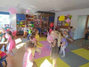 Jak co roku w naszym przedszkolu był to dzień pełen radości i zabawy. Muzyka, gwar i śmiech rozbrzmiewały od samego rana. Wychowawczynie przygotowały wiele atrakcji w otoczeniu mnóstwa kolorowych balonów. Były zorganizowane konkursy, gry, zabawy i tańce przy ulubionej muzyce. Piękna pogoda sprzyjała zabawom na świeżym powietrzu. Z niespodziewaną wizytą odwiedził nas Burmistrz Gołdapi Pan Konrad Kazaniecki, który wręczył przedszkolakom upominki. Wiele radości sprawiły również prezenty podarowane przez Panią Dyrektor Annę Budzińską. Uśmiechnięte buzie przedszkolaków świadczyły o wspaniałej zabawie.