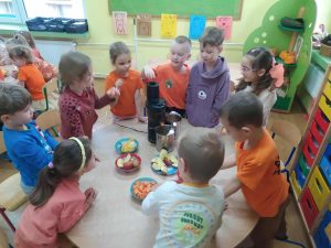 Wczoraj w naszym przedszkolu obchodziliśmy Dzień Pomarańczowej Wstążki, podkreślając wagę życzliwości, empatii i wspólnego działania. Niedawno odbył się także Dzień Zdrowego Jedzenia. Celebrowaliśmy ten pomarańczowo – zdrowotny klimat w wyjątkowo smaczny sposób. Nasze Pięciolatki B przygotowały świeżo wyciskany sok owocowy, zamieniając się na chwilę w małych kucharzy i ekspertów od zdrowego jedzenia. Dzieci z ciekawością odkrywały, jak wyglądają i pachną wybrane owoce, a potem przy małej pomocy dorosłych wyciskały z nich soczyste witaminy. W sali zrobiło się naprawdę zdrowo, pomarańczowo